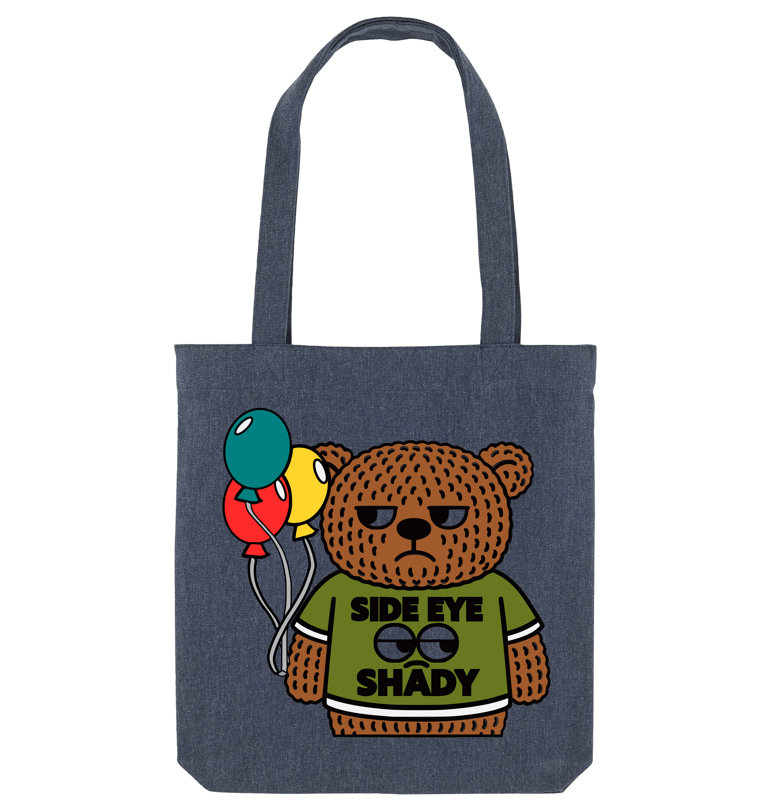 Product Details: Lightweight woven tote bag with a folded top edge in organic and recycled materials so we keep the planet happy. Its long handles are made with reinforced stitching so can be carried over the shoulder or by hand and of course it has the awesome Side Eye Shady Bear to the side.